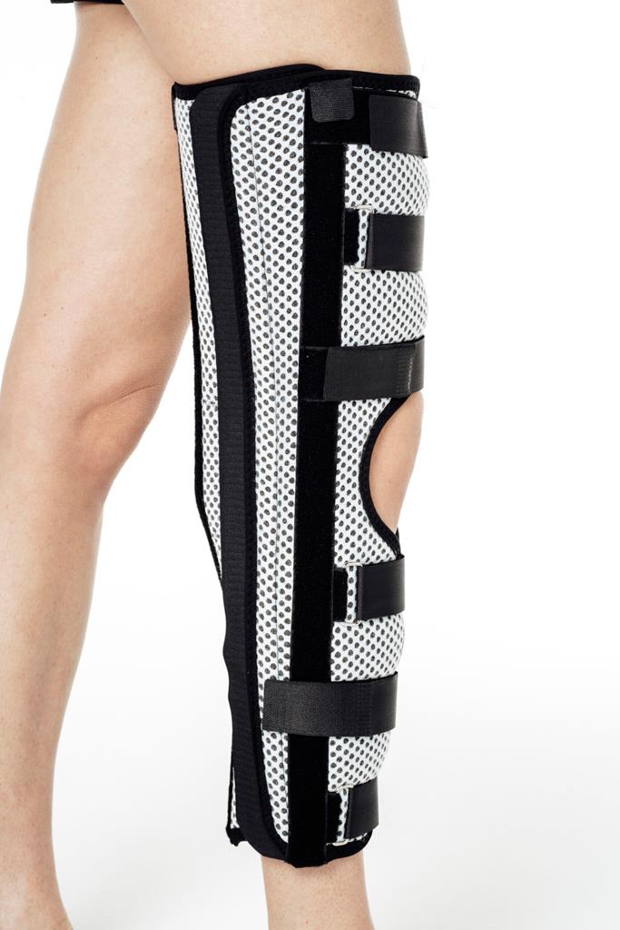 Immobilizzatore per ginocchio, realizzato in tessuto resistente e morbido con elevato potere traspirante, con fasce di chiusura a strappo, stecche in alluminio malleabili ed estraibili che consentono di adattare l’immobilizzatore a ogni circonferenza della gamba. La parte interna è rivestita di materiale anallergico con supporto interno al muscolo popliteo.