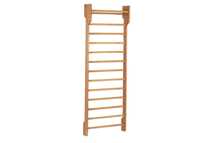 Spalliera svedese singola, in legno di faggio verniciato al naturale, con zanche per l’ancoraggio bianche in acciaio zincato.