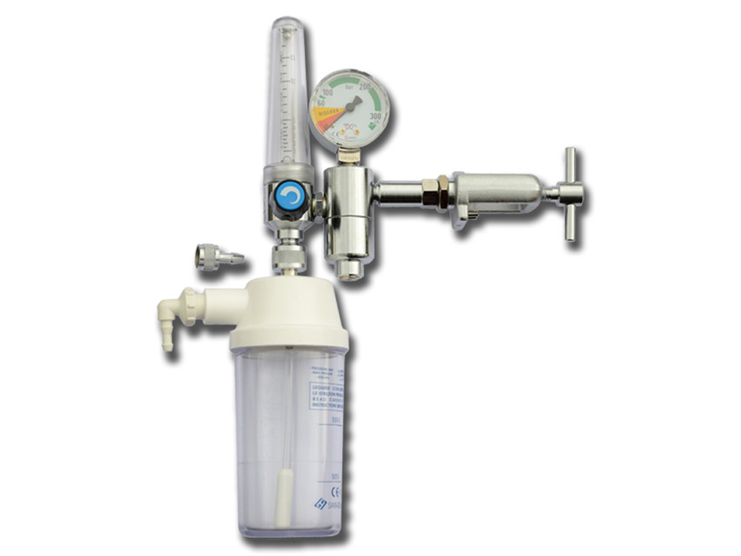 Riduttore di pressione dotato di valvola di rilascio, manometro ad alta pressione con flussimetro regolabile 0-15 litri/min. e umidificatore collegabile alla valvola della bombola.