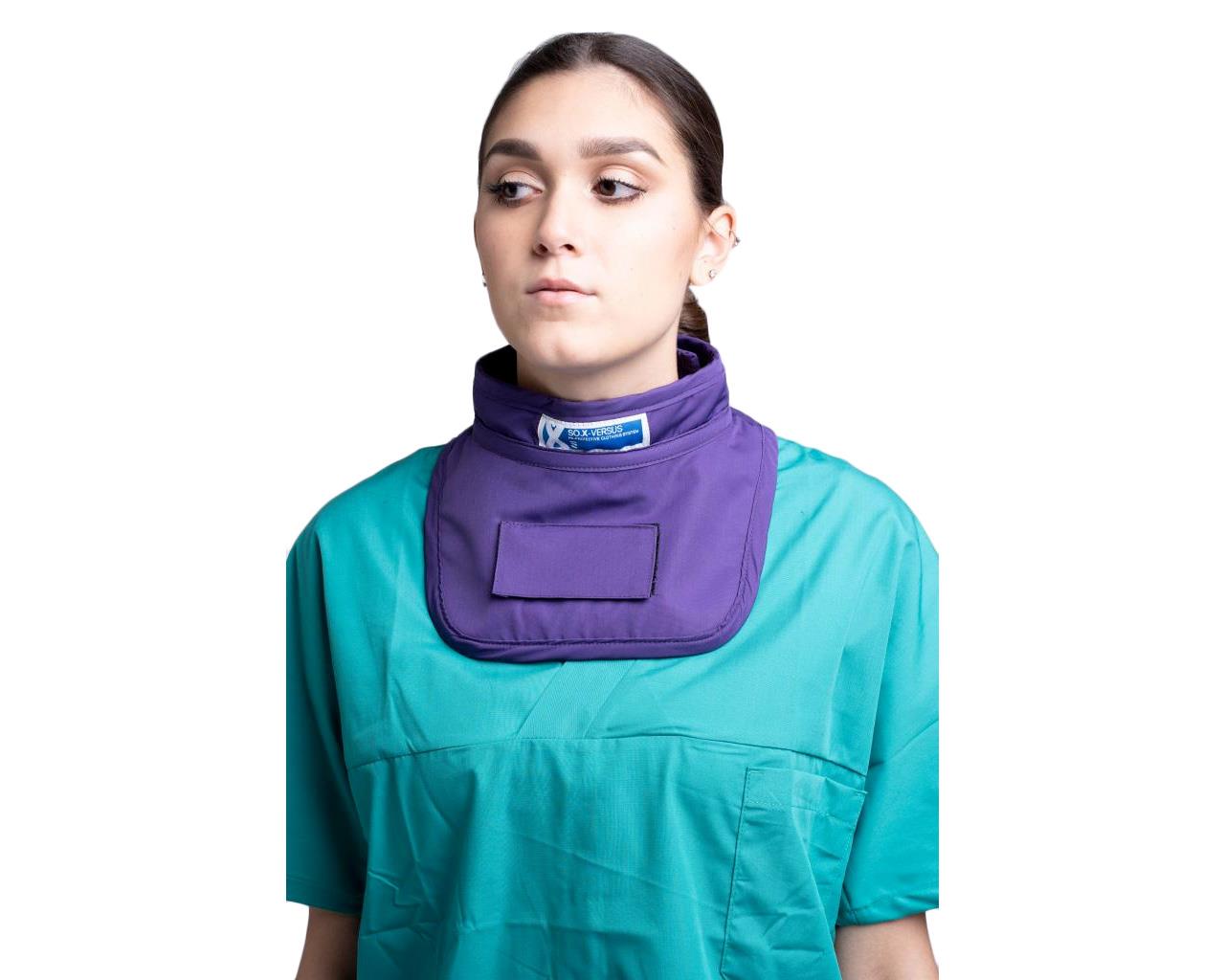 Collare paratiroide anti raggi-X con allacciatura regolabile mediante velcro e bordato con il tessuto di rivestimento; le cuciture sono effettuate con filato in poliestere ad alta tenacità.