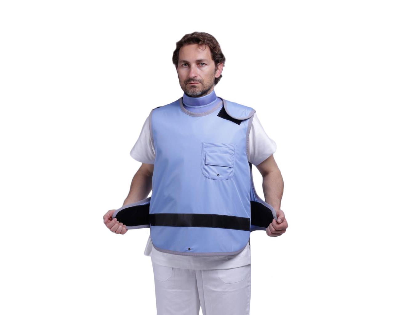 Corpetto radioprotettivo composto da una parte frontale e due mezze posteriori parzialmente sovrapposte, con chiusura incrociata sui fianchi mediante velcro con elastico cucito nelle due parti posteriore per regolazione chiusura. Spalle imbottite sovrapposte rifinite con nastro tipo "gros grein" con applicato, nella parte terminale, un bottone a pressione kappa femmina per ancoraggio del copribraccio. Sulla spalla sinistra si sovrappongono, e sono regolabili mediante velcro, la parte posteriore destra e la parte anteriore sinistra. Taschino bordato con tessuto trilaminato applicato sul petto a sinistra. Velcro femmina porta logo aziendale, con misure 10×5 cm, applicato sul taschino e coperto da velcro maschio foderato in tessuto trilaminato. Cuciture con filato in poliestere ad alta tenacità. Il capo è interamente bordato con nastro tipo “gros” e presenta l’etichettatura prevista dalla normativa di riferimento, codice a barre e TAG RFID per la sua rintracciabilità.