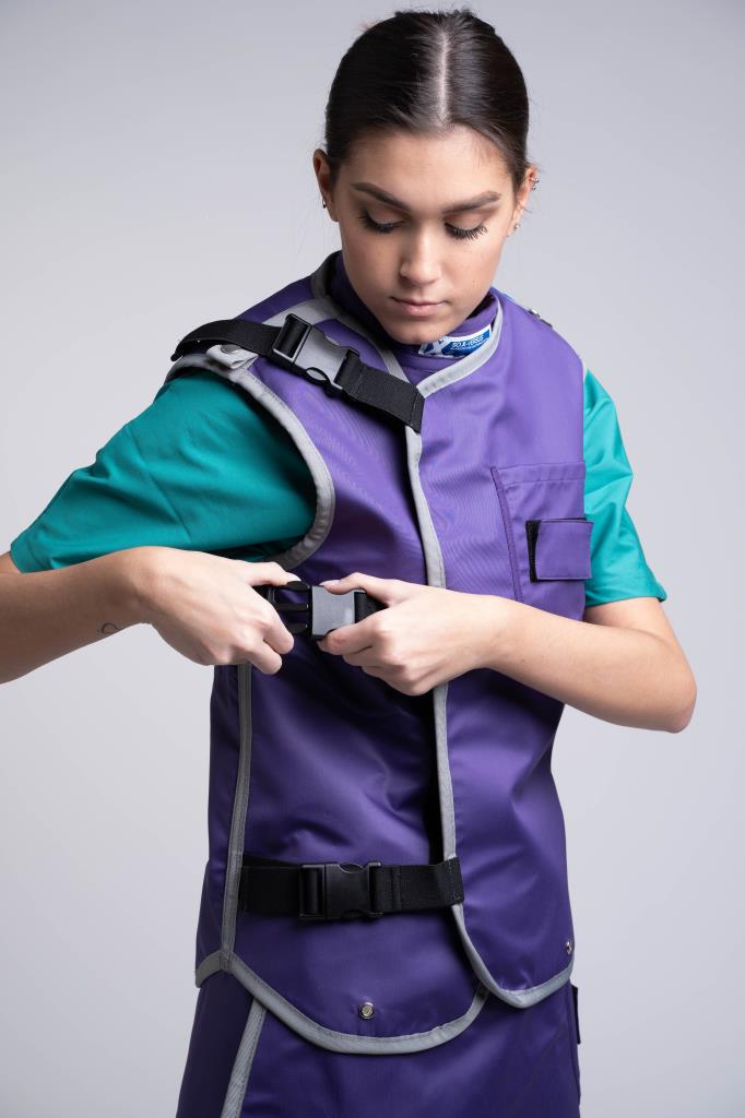 Corpetto radioprotettivo da donna composto da due strati anteriori ed uno posteriore, con allacciatura frontale sovrapposta a sinistra con chiusura mediante 3 fibbie a sgancio rapido fissate su elastico regolabile e 3 tratti di velcro posizionati tra le allacciature.