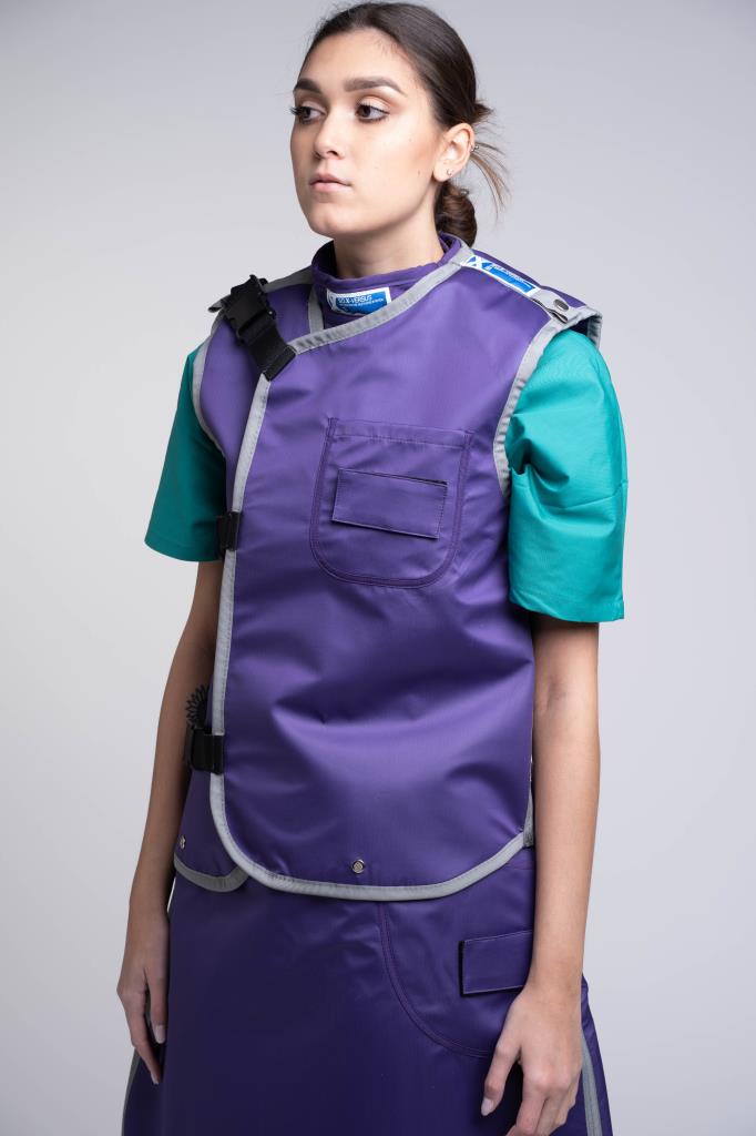 Corpetto radioprotettivo da donna composto da due strati anteriori ed uno posteriore, con allacciatura frontale sovrapposta a sinistra con chiusura mediante 3 fibbie a sgancio rapido fissate su elastico regolabile e 3 tratti di velcro posizionati tra le allacciature.