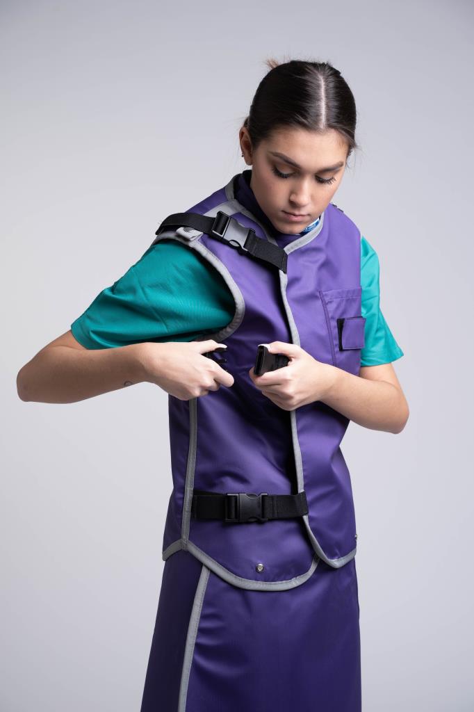 Corpetto radioprotettivo da donna composto da due strati anteriori ed uno posteriore, con allacciatura frontale sovrapposta a sinistra con chiusura mediante 3 fibbie a sgancio rapido fissate su elastico regolabile e 3 tratti di velcro posizionati tra le allacciature.