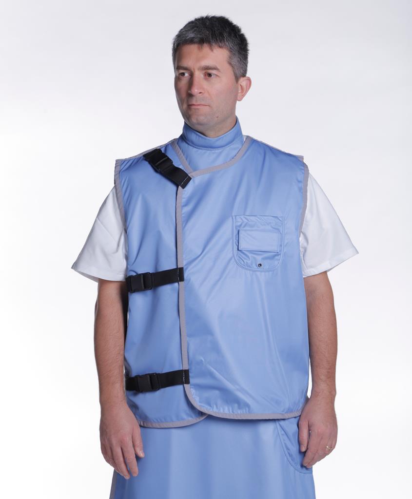Corpetto radioprotettivo da uomo composto da due strati anteriori ed uno posteriore, con allacciatura frontale sovrapposta a destra con chiusura mediante 3 fibbie a sgancio rapido fissate su elastico regolabile e 3 tratti di velcro posizionati tra le allacciature.