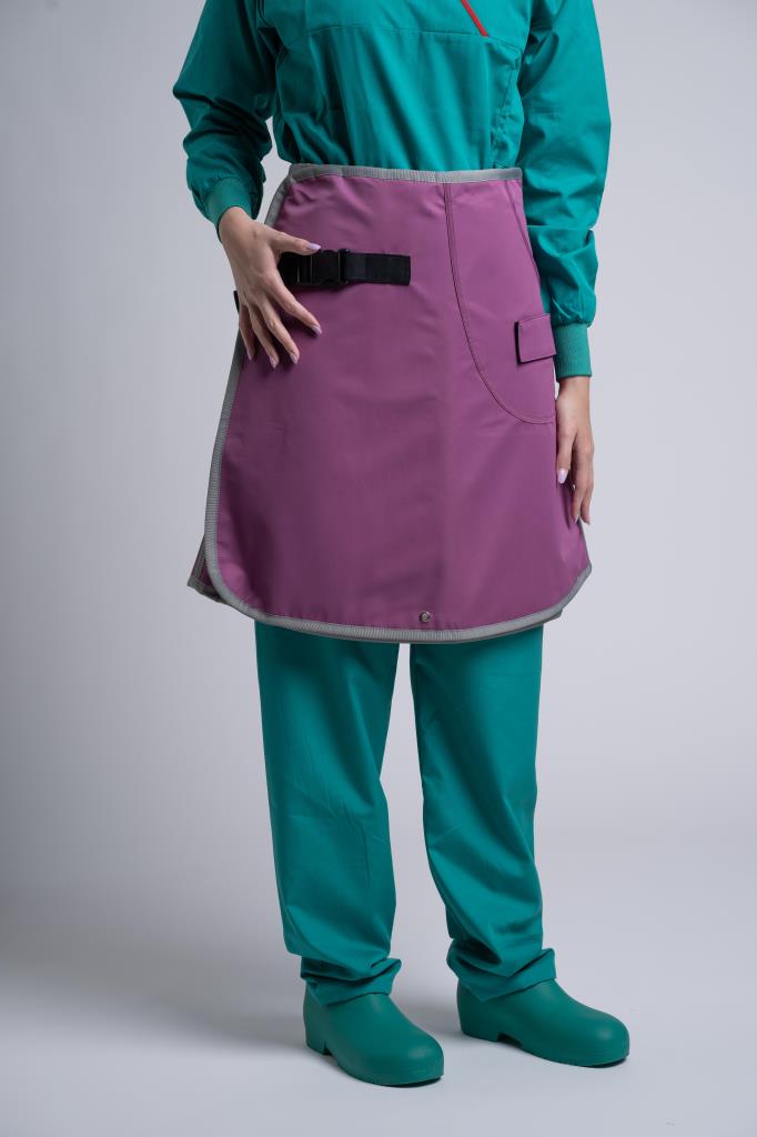 Gonna radioprotettiva composta da due strati anteriori, che si sovrappongono interamente, ed uno posteriore; allacciatura laterale a destra mediante fibbia a sgancio rapido esterna regolabile, dell'altezza di 3,5 cm, cucita sul lato anteriore.