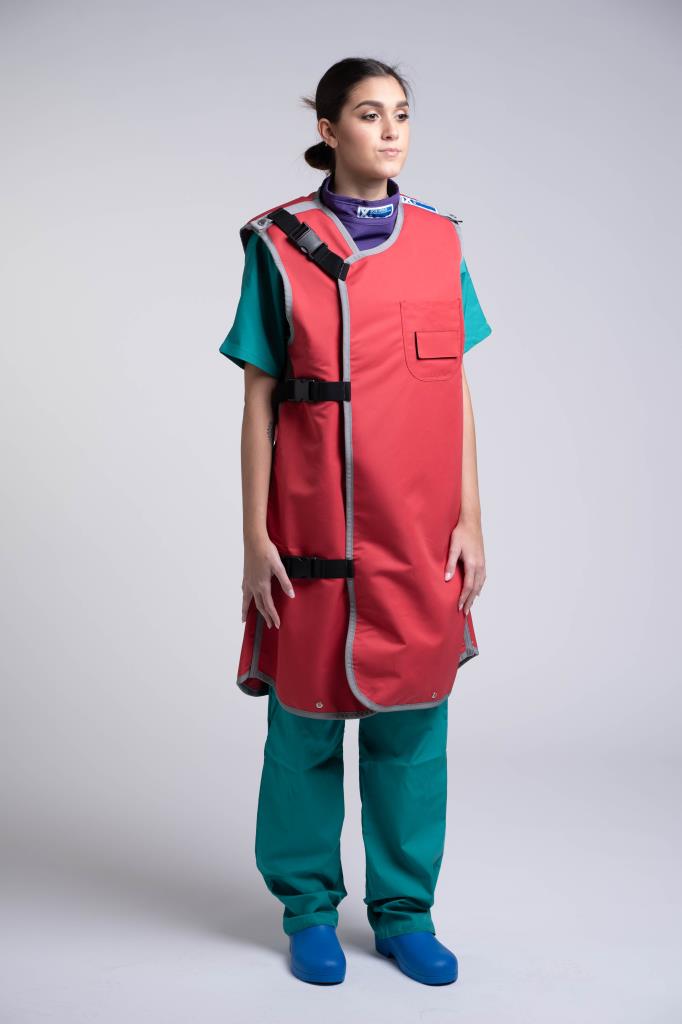 Grembiule anti raggi-X chiuso, composto da due strati frontali e uno posteriore, con allacciatura frontale sovrapposta a sinistra mediante 3 fibbie a sgancio rapido fissate su elastico regolabile e 3 tratti di velcro posizionati tra le allacciature.