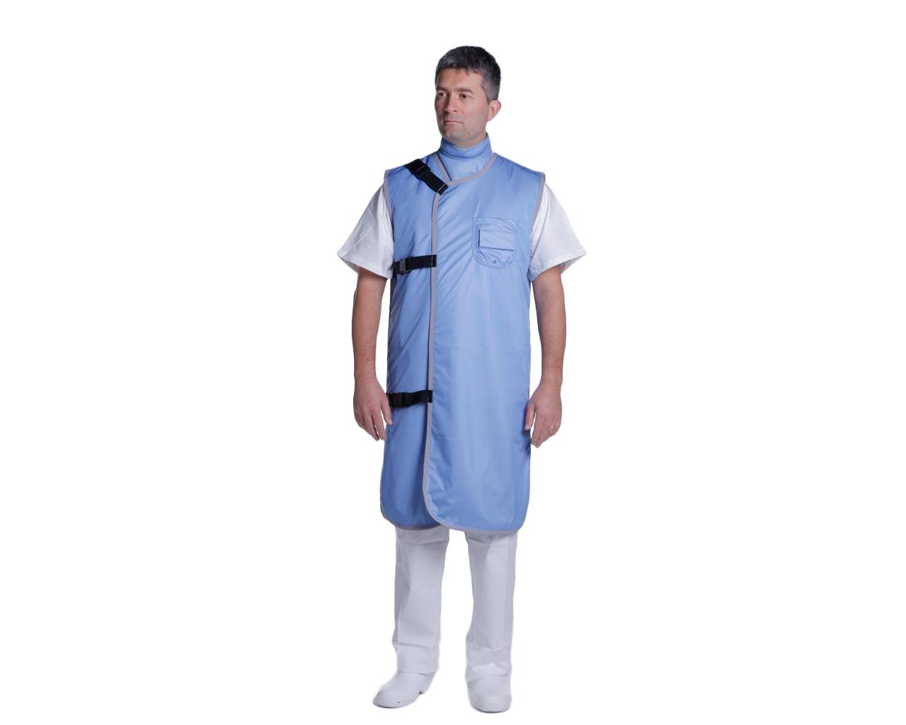 Grembiule anti raggi-X chiuso, composto da due strati frontali e uno posteriore, con allacciatura frontale sovrapposta a destra mediante 3 fibbie a sgancio rapido fissate su elastico regolabile e 3 tratti di velcro posizionati tra le allacciature.