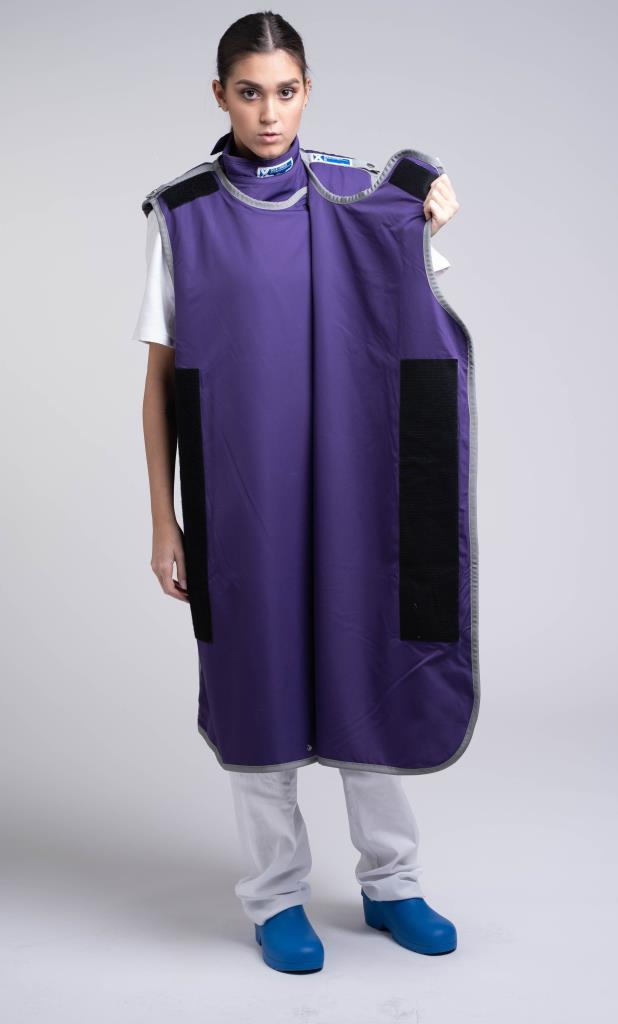 Grembiule anti raggi X composto da due strati anteriori ed uno posteriore, con allacciatura sovrapposta a destra da fianco a fianco chiusa mediante tratti di velcro a strappo morbido sulle spalle e internamente sul fianco sinistro, con altezza di 5 cm, e sul fianco destro, con velcro di 10 cm di altezza.