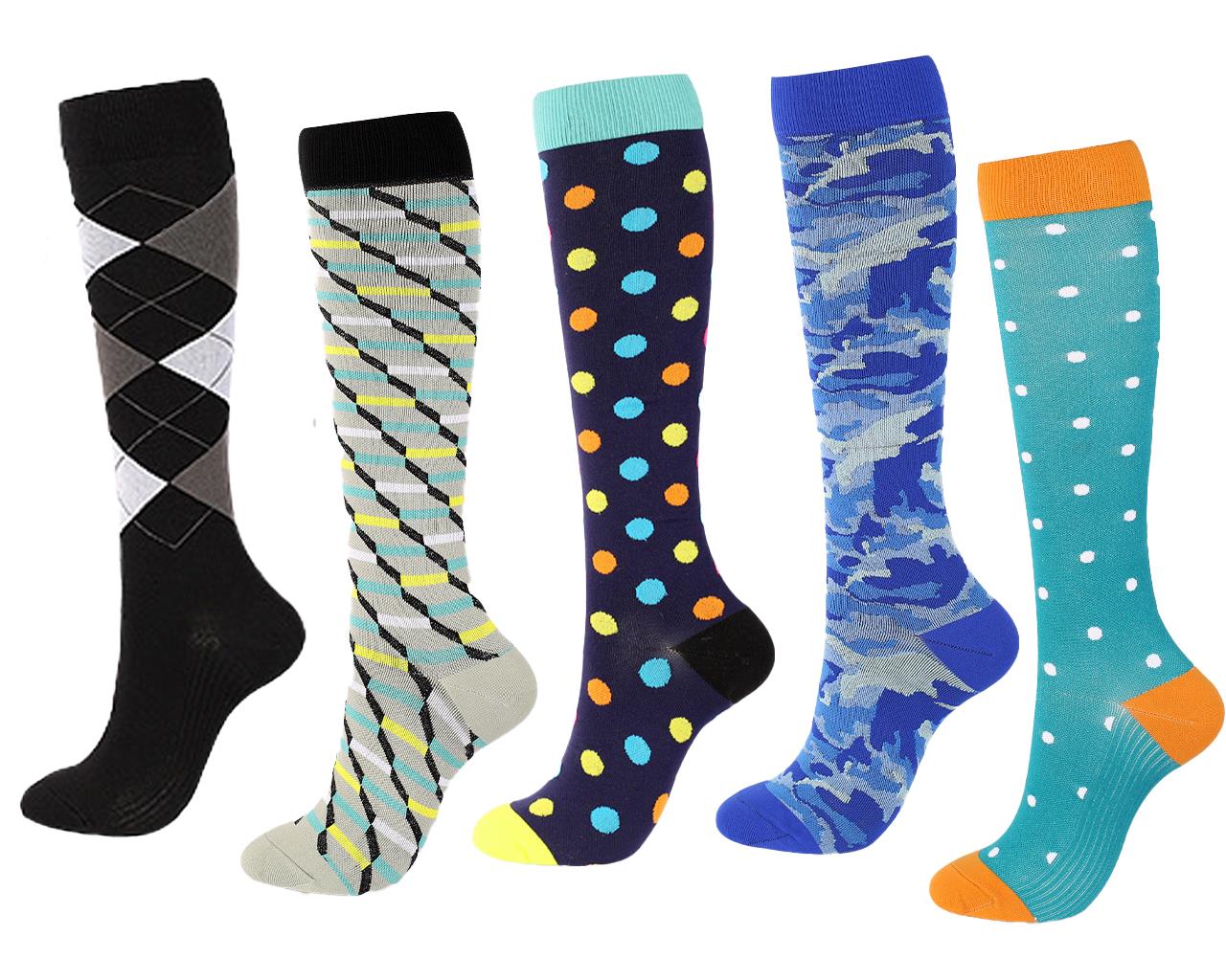 Calze colorate lunghe fino al ginocchio con compressione graduata per migliorare la circolazione sanguigna.