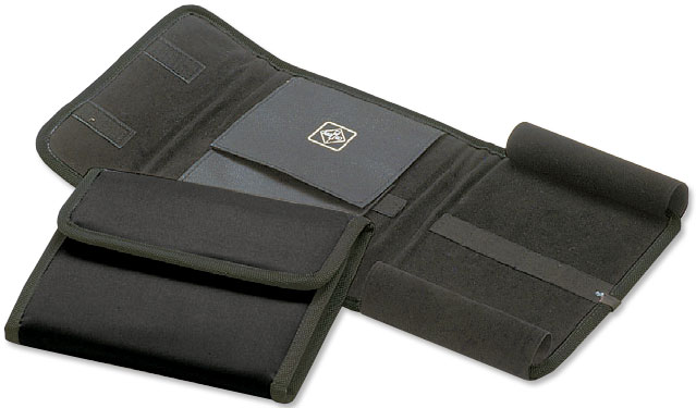 Portaferri in cordura nera. Contiene fino a 12 strumenti, imbottito con tessuto simil velluto, con protezioni e chiusura in velcro.